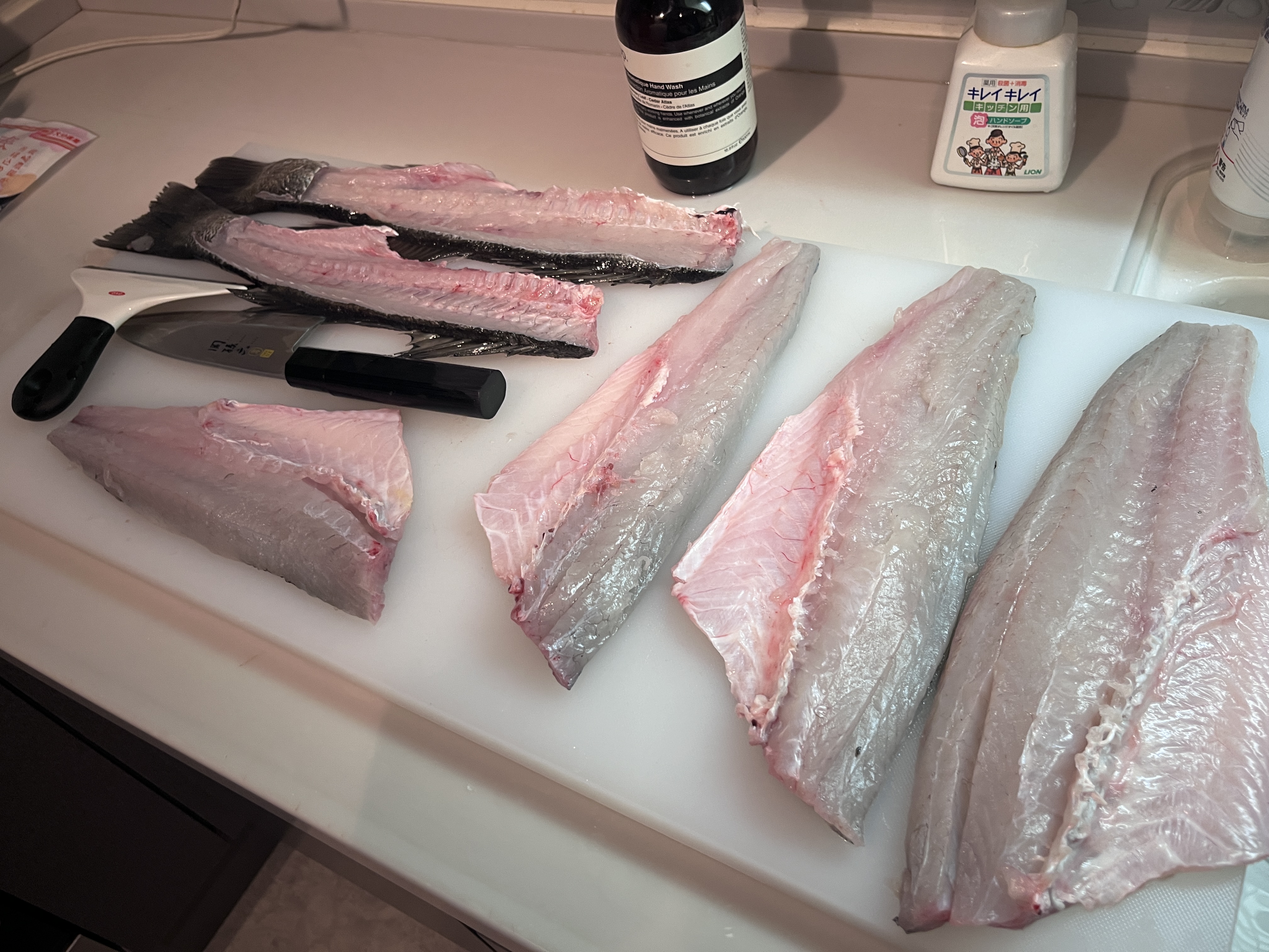 冬のシーバスは痩せていますね。と言いつつ、捌く練習用として持ち帰っておろしました。三枚おろしは割と板についてきたような。