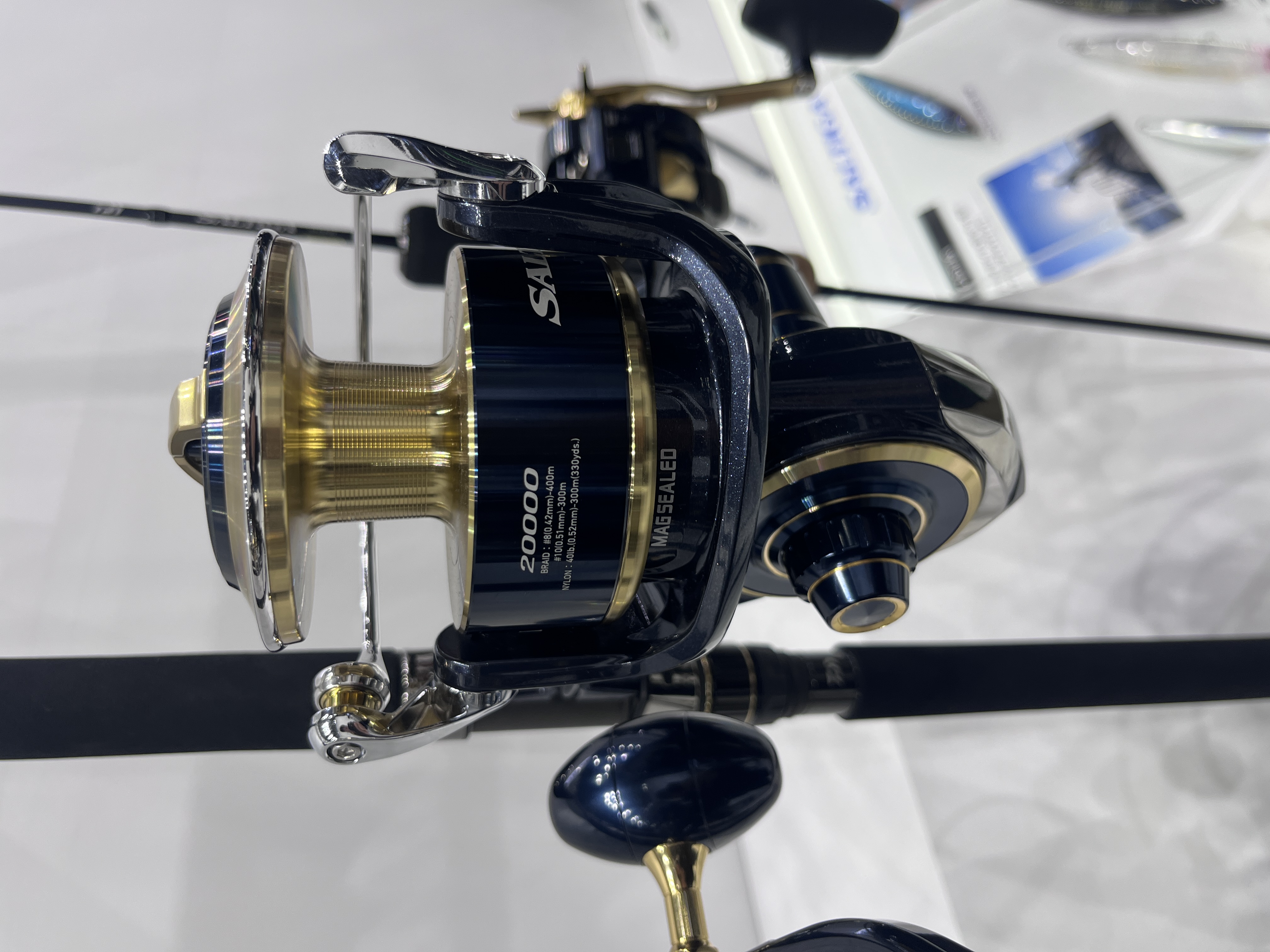 会場では、漁獲高制限で行けるか行けないか分からないマグロ釣りのために、大物キャスティング用のロッドとリールを物色し、天龍のロッドコーナーにてギンバルをつけて曲げ体験させていただきました。